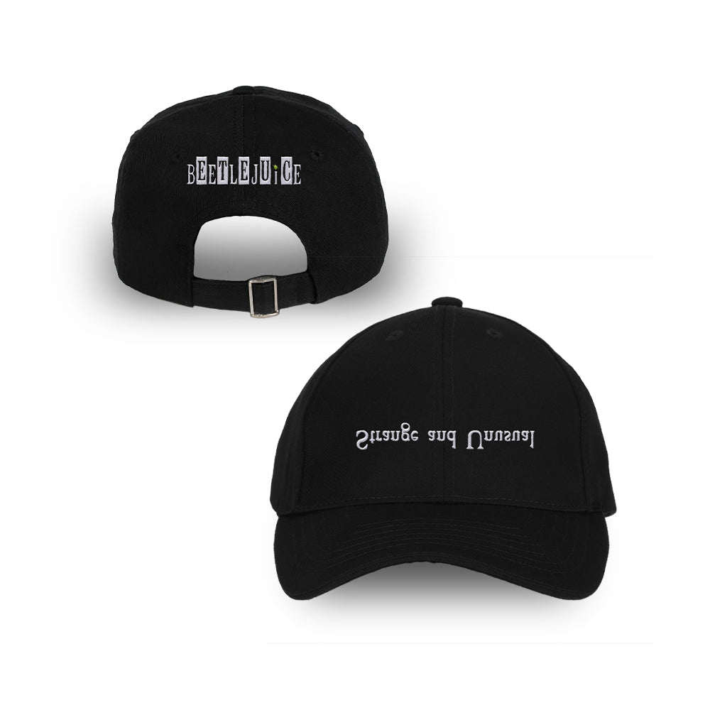 Bring a bit of the supernatural into your life with this adjustable hat featuring the upside-down quote, "Strange and Unusual", along with the Beetlejuice the Musical on the back.
